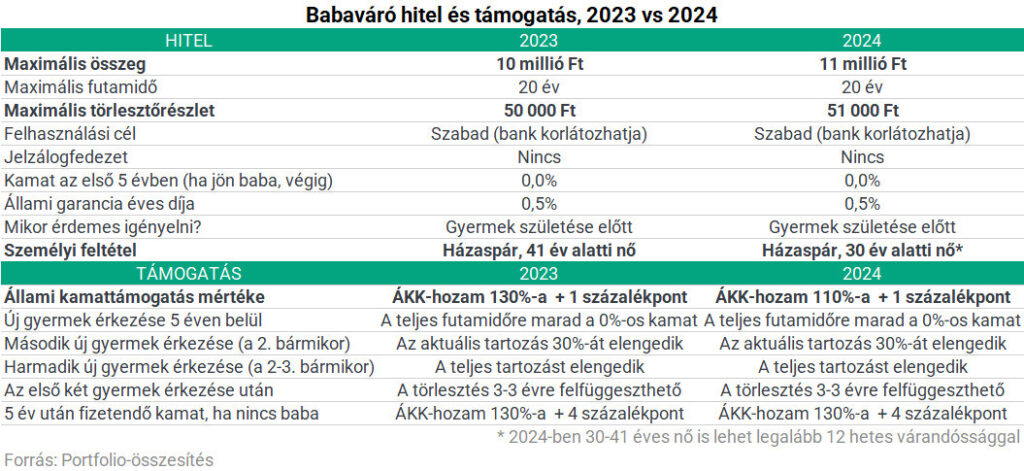 Változások sorát hozta 2024. január 1-je a babaváró hitel szabályaiban. A két legfontosabbról sokan hallottak: a maximális összeg 10 millióról 11 millió forintra emelkedett, a hitelfelvevő házaspár női tagjára vonatkozó életkori korlátot pedig 41-ről 30 évre szállították le. Utóbbi alól kivétel, ha még idén eléri a 12 hetes várandósságot a feleség. Ezen kívül is történtek azonban változások, ezért is aktuális, hogy összefoglaljuk a babaváró hitel lényegét, külön jelezve az újdonságokat. Babaváró 2024-es szabályok, feltételek, részletek egy helyen!
